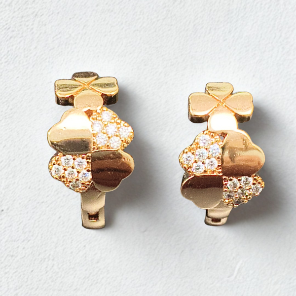 Step into elegance with the Golden Clover Luxe Earrings, designed to bring charm and sparkle to every look. Featuring a unique four-leaf clover motif crafted from alternating polished gold and encrusted crystal segments, these earrings symbolize good fortune and refined taste. The top bow-like detail adds a delicate, feminine touch, making these a standout piece for any jewelry collection.