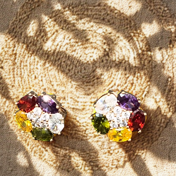 Brighten your look with the vibrant elegance of Spectrum Bloom Studs, a dazzling celebration of color and charm. These multicolor gemstone-inspired earrings are designed in a floral cluster setting, combining ruby red, amethyst purple, emerald green, citrine yellow, and brilliant white stones—each symbolizing joy, energy, and grace.